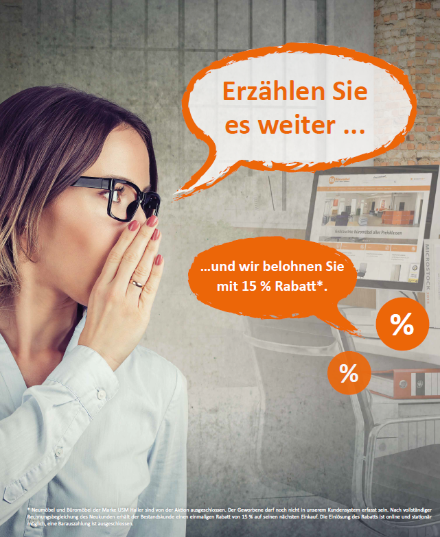 *Nicht mit anderen Rabatten kombinierbar. Neumöbel und Büromöbel der Marke USM Haller sind von der Aktion ausgeschlossen. Der Geworbene darf noch nicht in unserem Kundensystem erfasst sein. Nach vollständiger Rechnungsbegleichung des Neukunden erhält der Bestandskunde einen einmaligen Rabatt von 15% auf seinen nächsten Einkauf. Die Einlösung des Rabatts ist online und stationär möglich, eine Barauszahlung ist ausgeschlossen.