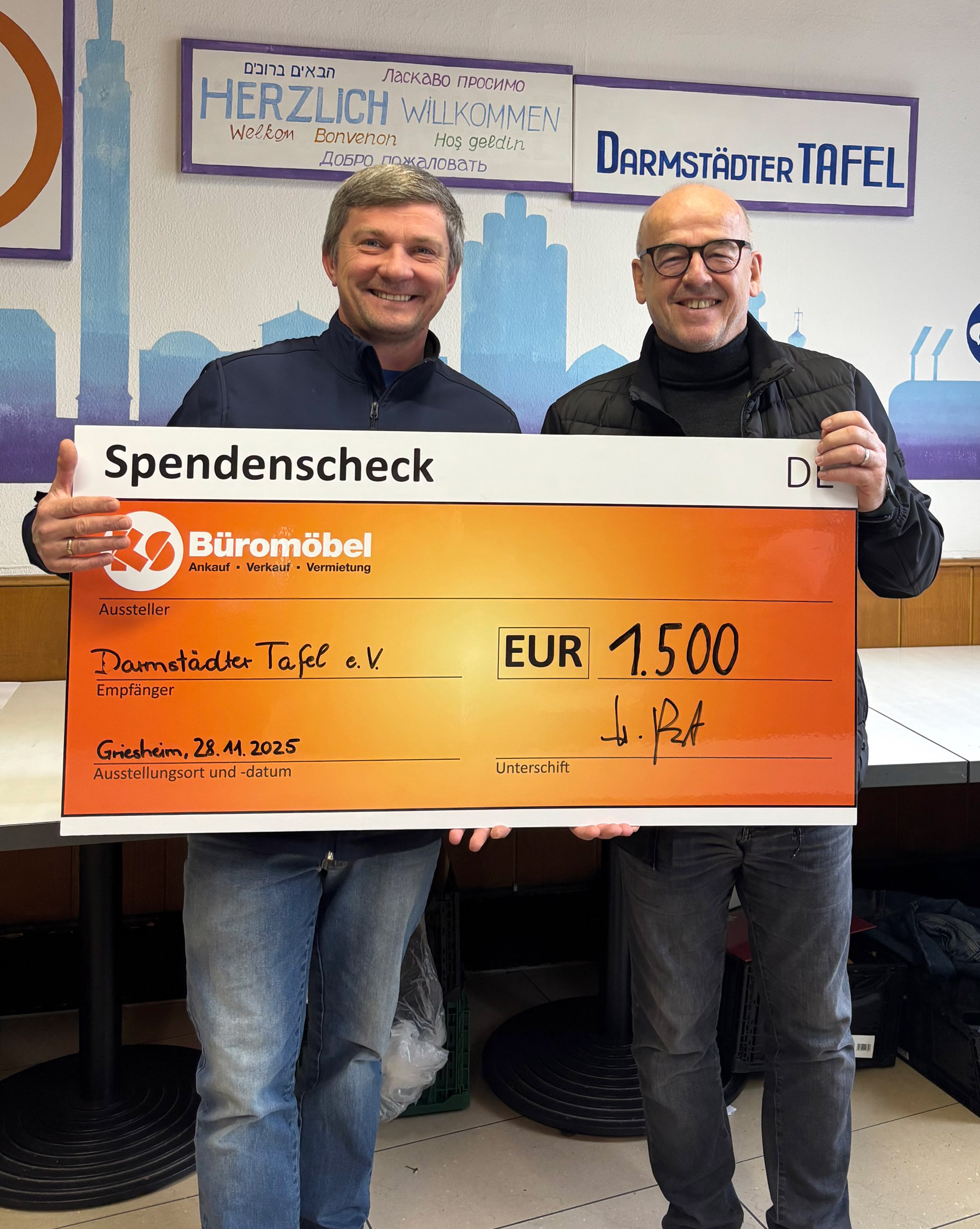 Um dieses Engagement tatkräftig zu unterstützen, spendet KS Büromöbel in diesem Jahr erneut 1.500 Euro. Herbert Pest, Geschäftsführer von KS Büromöbel, übergab einen symbolischen Spendenscheck an Roman Zarenkow, Wirtschaftsleiter der Darmstädter Tafel, und bedankte sich bei allen, die sich aktiv für die Tafel einsetzen.